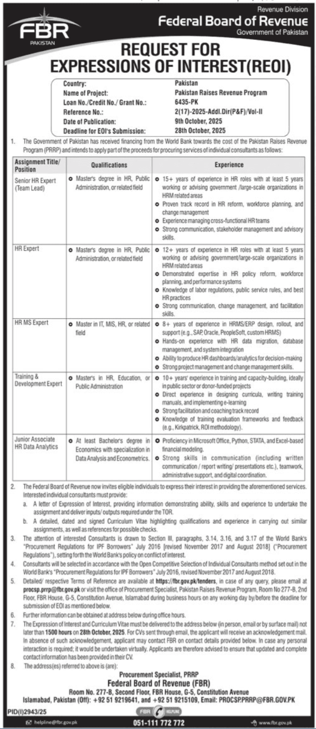 Federal Board of Revenue FBR latest Government Management jobs and others can be applied till 28 October 2025 or as per closing date in newspaper ad. Read complete ad online to know how to apply on latest Federal Board of Revenue FBR job opportunities.