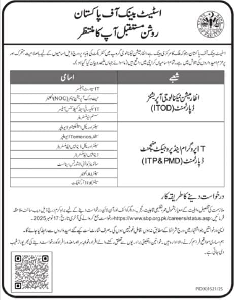 State Bank of Pakistan (SBP) invites applications for the following positions as per job advertisement published in daily Jang Newspaper on 3 November 2025 for location Karachi, Sindh, Pakistan: