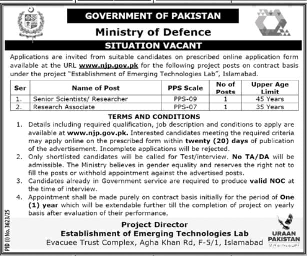 Ministry of Defence invites applications for the following positions as per advertisement published in daily Jang Newspaper dated 3 November 2025 for location Islamabad, Islamabad, Pakistan: