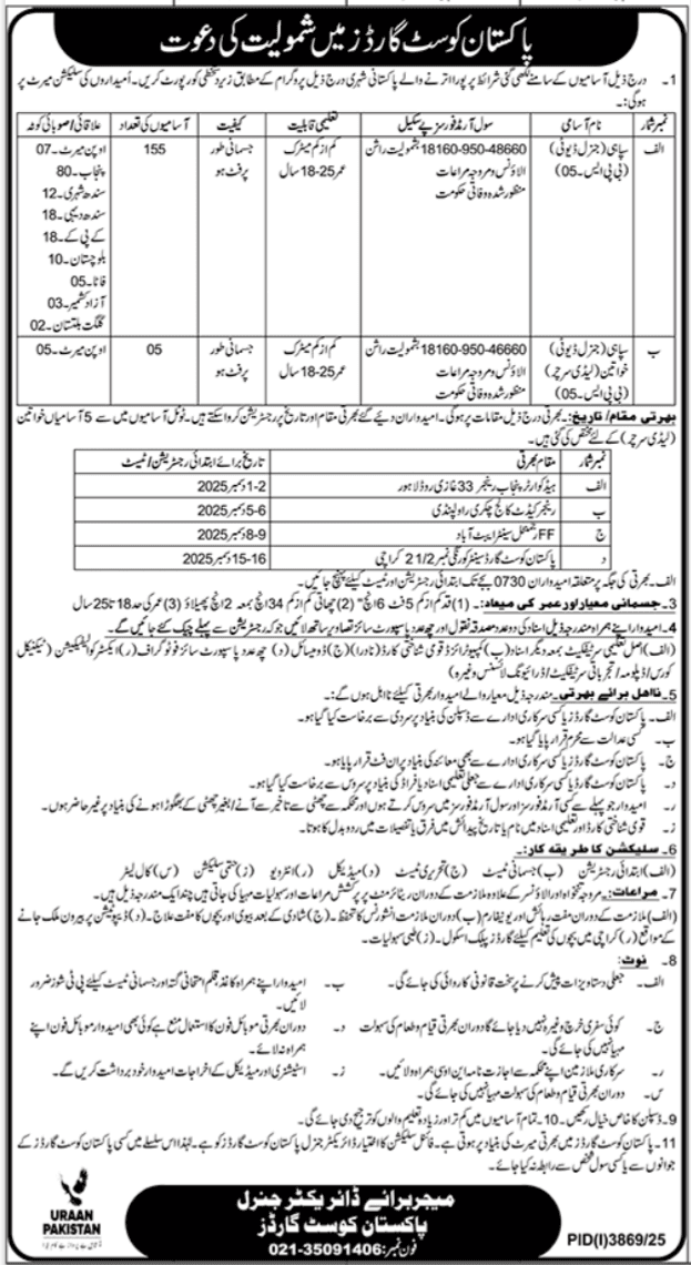 Pakistan Coast Guards jobs advertisement dated about 9 November 2025 in daily Jang Newspaper invites application for the vacant post of Sipahi in Karachi, Sindh, Pakistan. Candidates with Primary, Middle, and Matric educational background will be preferred.
