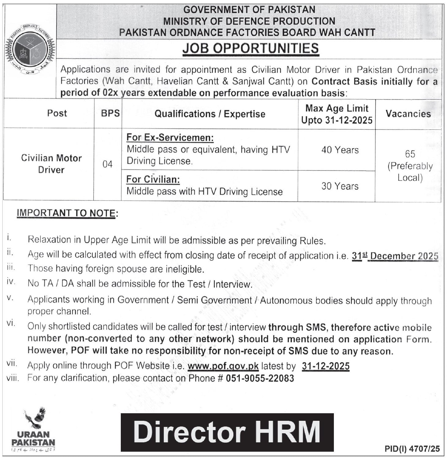 Ministry of Defence Production invites applications for job positions advertised in daily Express Tribune dated 8 December 2025 for following vacancies in Wah Cantt, wah cantt Punjab Pakistan: