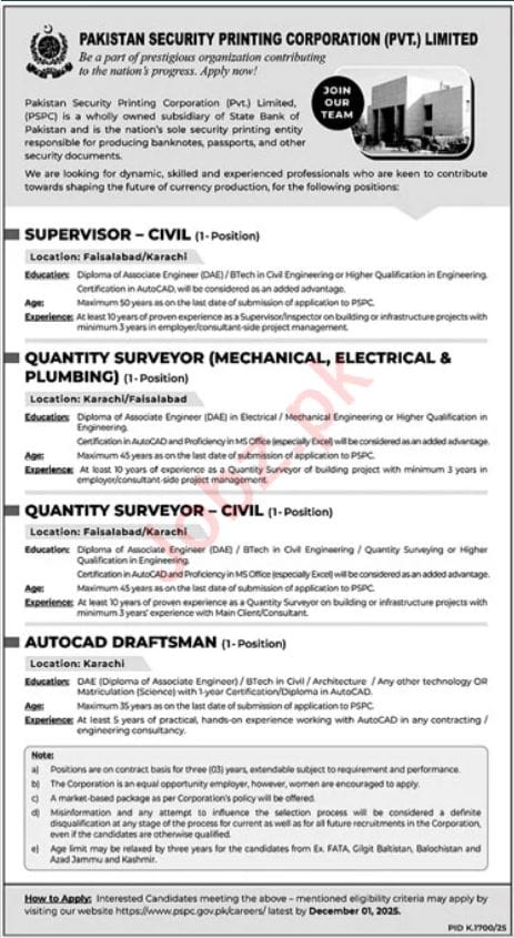 Latest Management jobs and others Government jobs in Pakistan Security Printing Corporation Pvt Ltd closing date is around December 1, 2025. Read complete ad online to know how to apply on latest Pakistan Security Printing Corporation Pvt Ltd job opportunities.